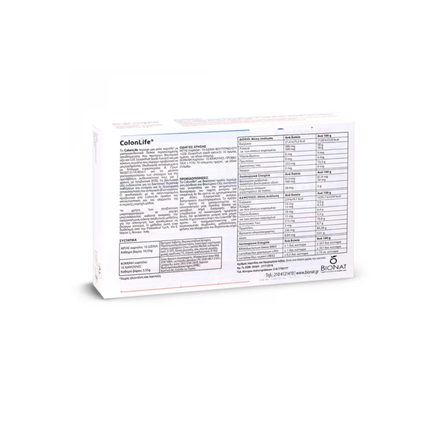 Με διαδοχική διαμόρφωση που περιλαμβάνει 10 δισκία με βουτυρικό οξύ και εκχύλισμα σπόρων γκρέιπφρουτ και 10 κάψουλες με προβιοτικά και πρεβιοτικά.
