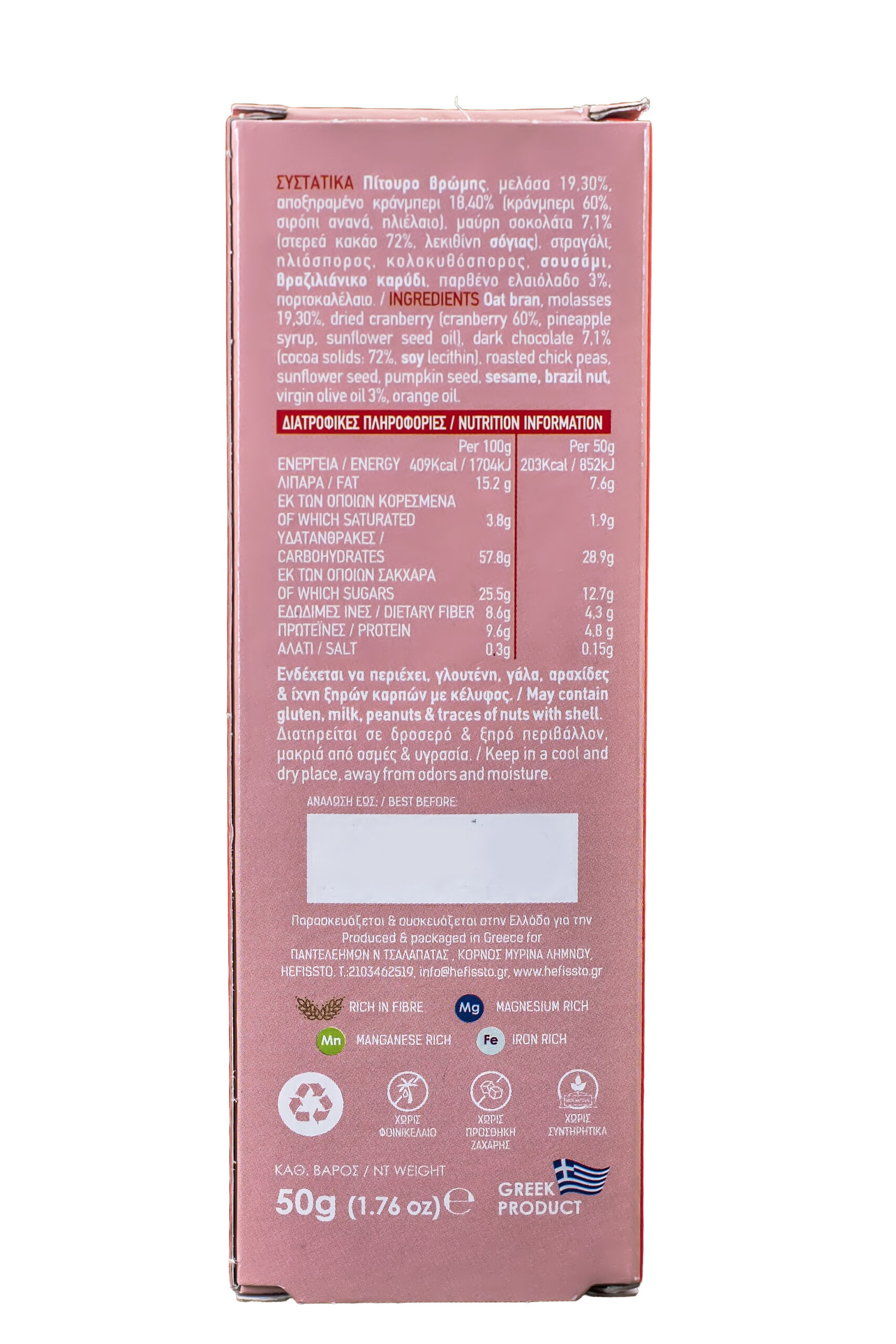 Πίτουρο βρώμης, μελάσα 19,3%, αποξηραμένα κράνμπερι 18,4% (κράνμπερι 60%, σιρόπι ανανά, ηλιέλαιο), μαύρη σοκολάτα 7,1% (στερεά κακάο 72%, λεκιθίνη σόγιας), στραγάλι, ηλιόσπορος, κολοκυθόσπορος, σουσάμι, βραζιλιάνικο καρύδι, παρθένο ελαιόλαδο 3%.