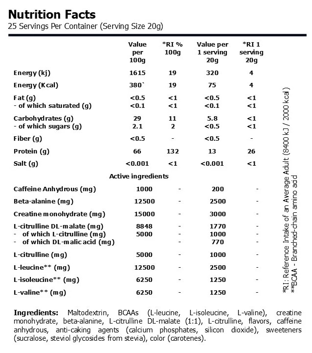 Το pre-workout είναι ένα ισχυρό μείγμα καφεΐνης, κρεατίνης, β-αλανίνης, L-κιτρουλίνης, μηλικής κιτρουλίνης και BCAA, σχεδιασμένο για να ενισχύει την ενέργεια, να βελτιώνει την εστίαση και να μεγιστοποιεί την απόδοση. Έρευνες δείχνουν ότι η οξεία ή μακροχρόνια χρήση μπορεί να ωφελήσει τους αθλητές βελτιώνοντας τη συνολική τους απόδοση.