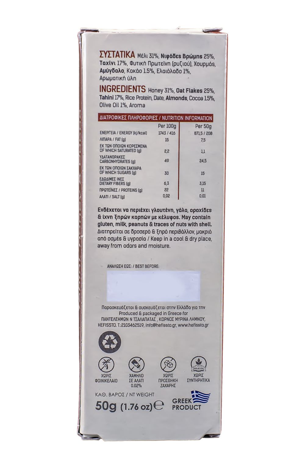 Ο συνδυασμός ταχινιού και μελιού δίνει μεσογειακό χαρακτήρα και θρεπτική πληρότητα, ενώ το κακάο ενισχύει τη γεύση με αντιοξειδωτική δύναμη και πλούσιο άρωμα. Οι νιφάδες βρώμης, οι χουρμάδες και τα αμύγδαλα προσφέρουν φυτικές ίνες, φυσικά σάκχαρα και πολύτιμα ιχνοστοιχεία. Η φυτική πρωτεΐνη ρυζιού ανεβάζει την περιεκτικότητα πρωτεΐνης στο 22%, ενώ το παρθένο ελαιόλαδο Hefissto προσθέτει αγνά, καλά λιπαρά.