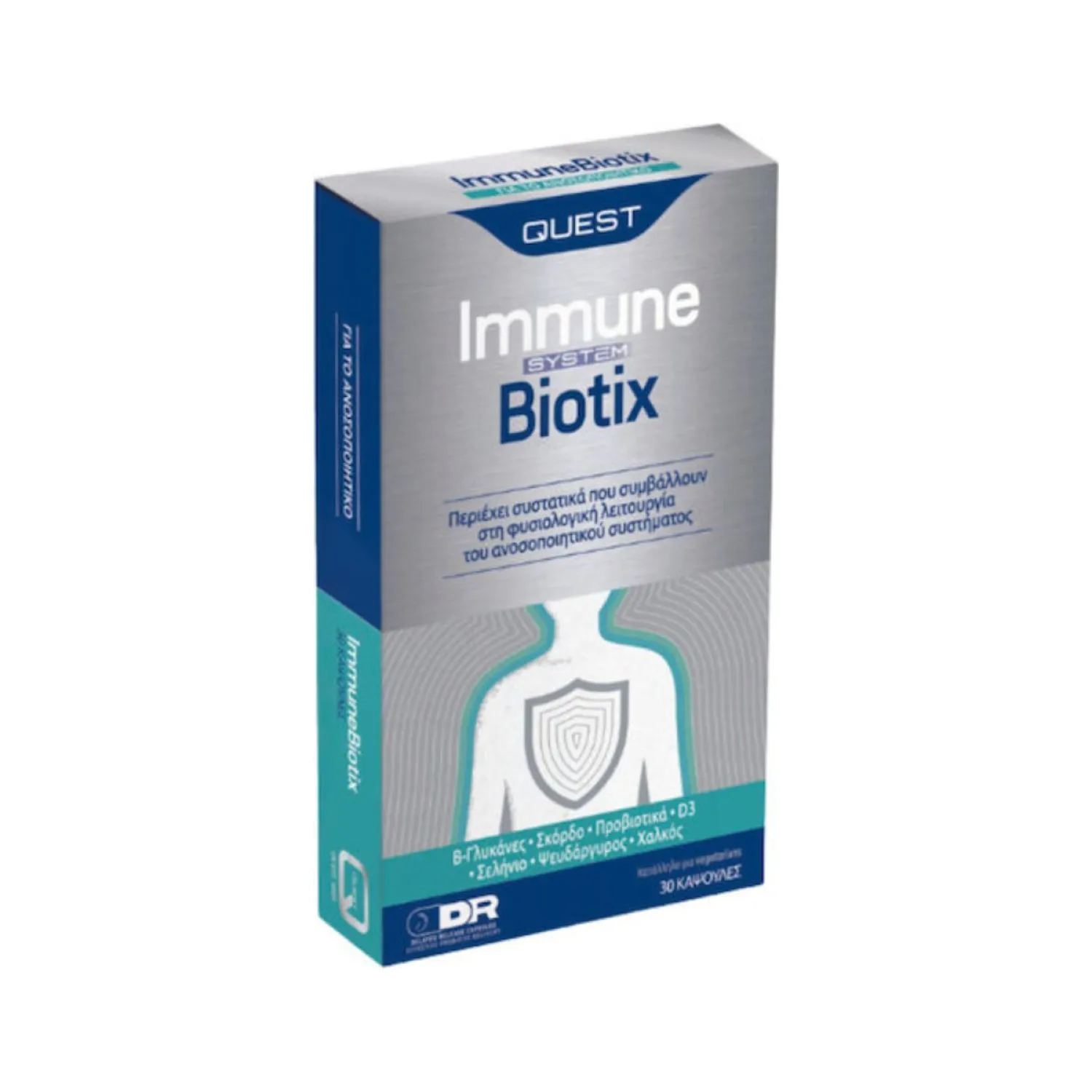 Το Immune Biotix της Quest είναι ένας μοναδικός συνδυασμός συστατικών που υποστηρίζουν το ανοσοποιητικό σύστημα. Η μοναδική του σύνθεση περιλαμβάνει βήτα 1-3, 1-6 γλυκάνες, εκχύλισμα σκόρδου ψυχρής ωρίμανσης, ψευδάργυρο, σελήνιο, χαλκό, βιταμίνη D και φιλικά βακτήρια.