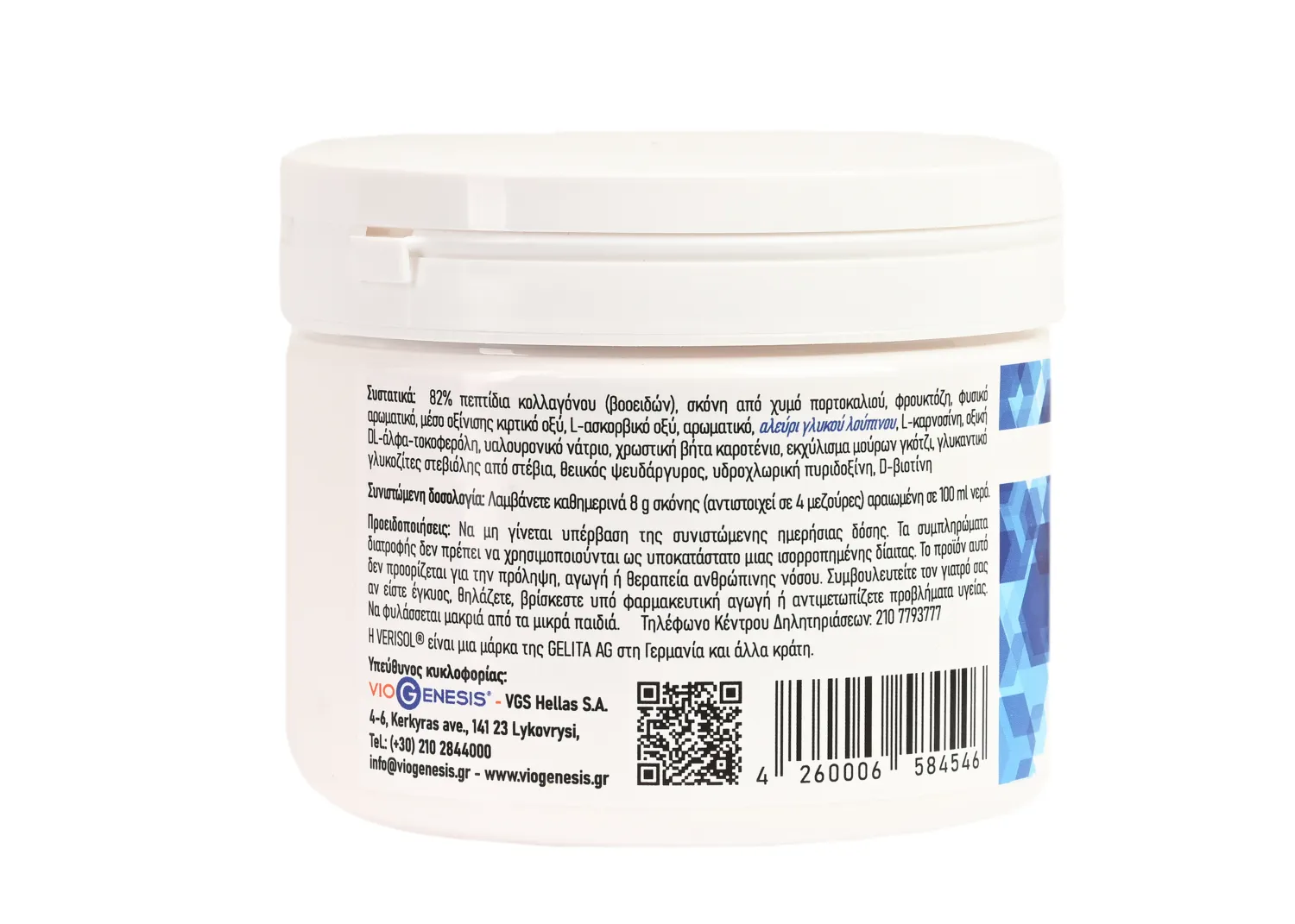 Κολλαγόνο Verisol® | Το προϊόν περιέχει κολλαγόνο Verisol®, το οποίο αποτελείται από πεπτίδια υδρολυμένου κολλαγόνου βοοειδών υψηλής βιοδιαθεσιμότητας. To Verisol® αποτελεί εμπορικό σήμα της GELITA.