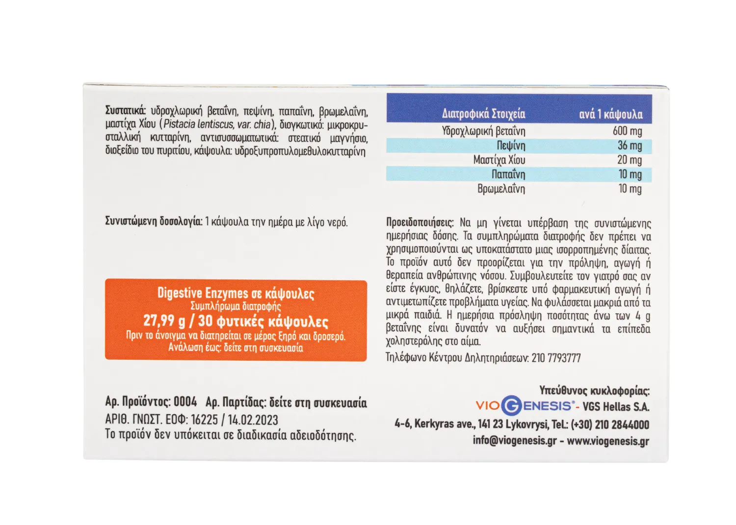 Το VioGenesis Digestive Enzymes είναι ένα συμπλήρωμα διατροφής το οποίο περιλαμβάνει υδροχλωρική βεταΐνη, τα πεπτικά ένζυμα πεψίνη, παπαΐνη και βρωμελαΐνη και μαστίχα Χίου.