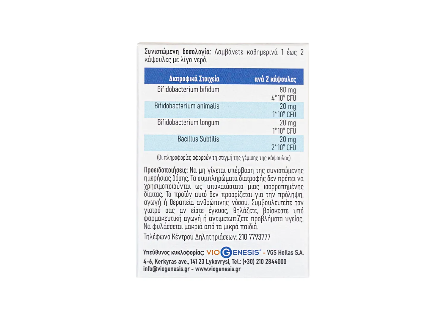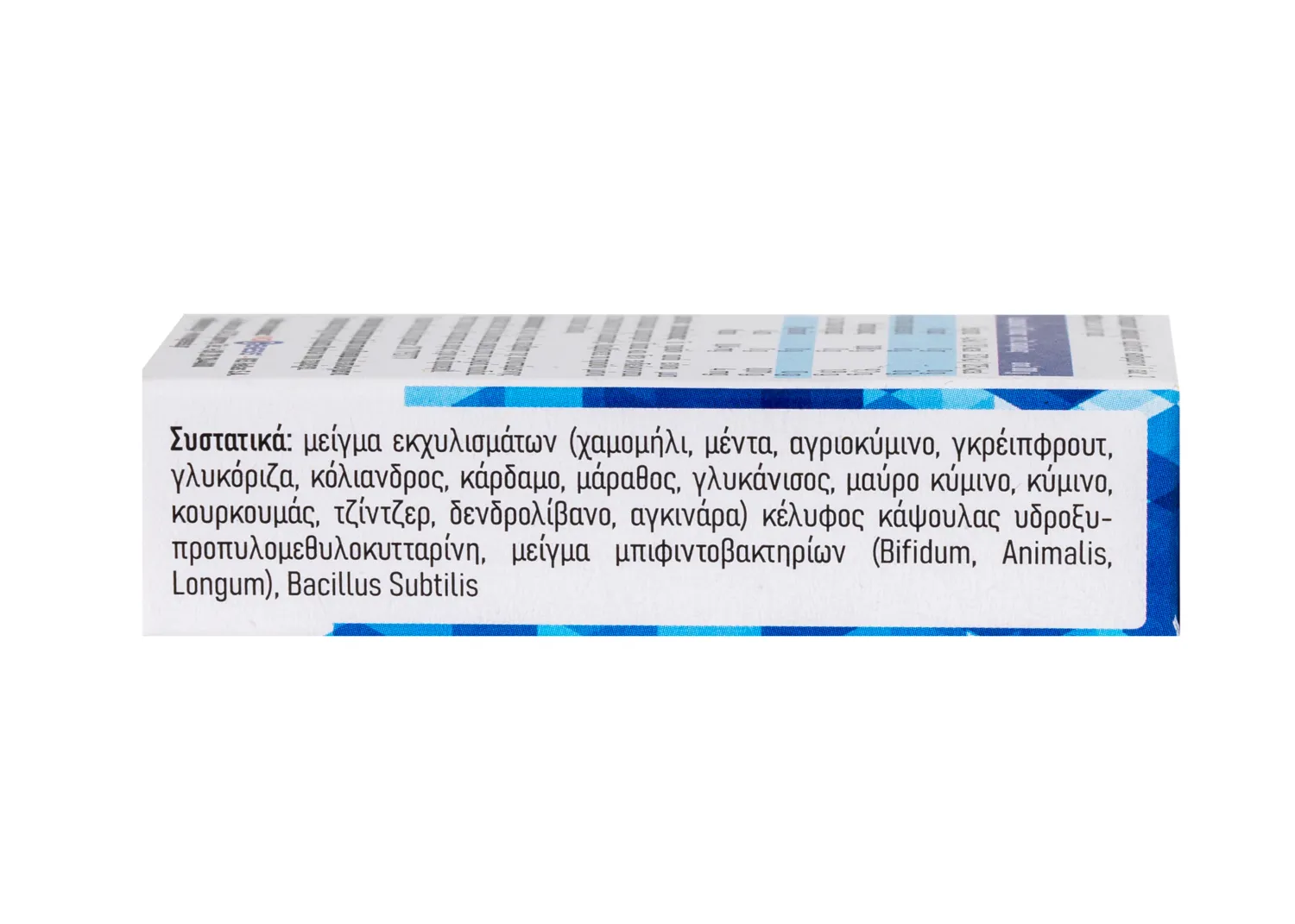 Μείγμα εκχυλισμάτων (χαμομήλι, μέντα, αγριοκύμινο, γκρέιπφρουτ, γλυκόριζα, κόλιανδρος, κάρδαμο, μάραθος, γλυκάνισος, μαύρο κύμινο, κύμινο, κουρκουμάς, τζίντζερ, δενρολίβανο, αγκινάρα), μείγμα μπιφιντοβακτηρίων (66.6% Bifidobacterium bifidum 50 billion cfu/g, 16.7% Bifidobacterium animalis 50 billion cfu/g, 16.7% Bifidobacterium longum 50 billion cfu/g), Bacillus Subtilis 100 billion spores/g