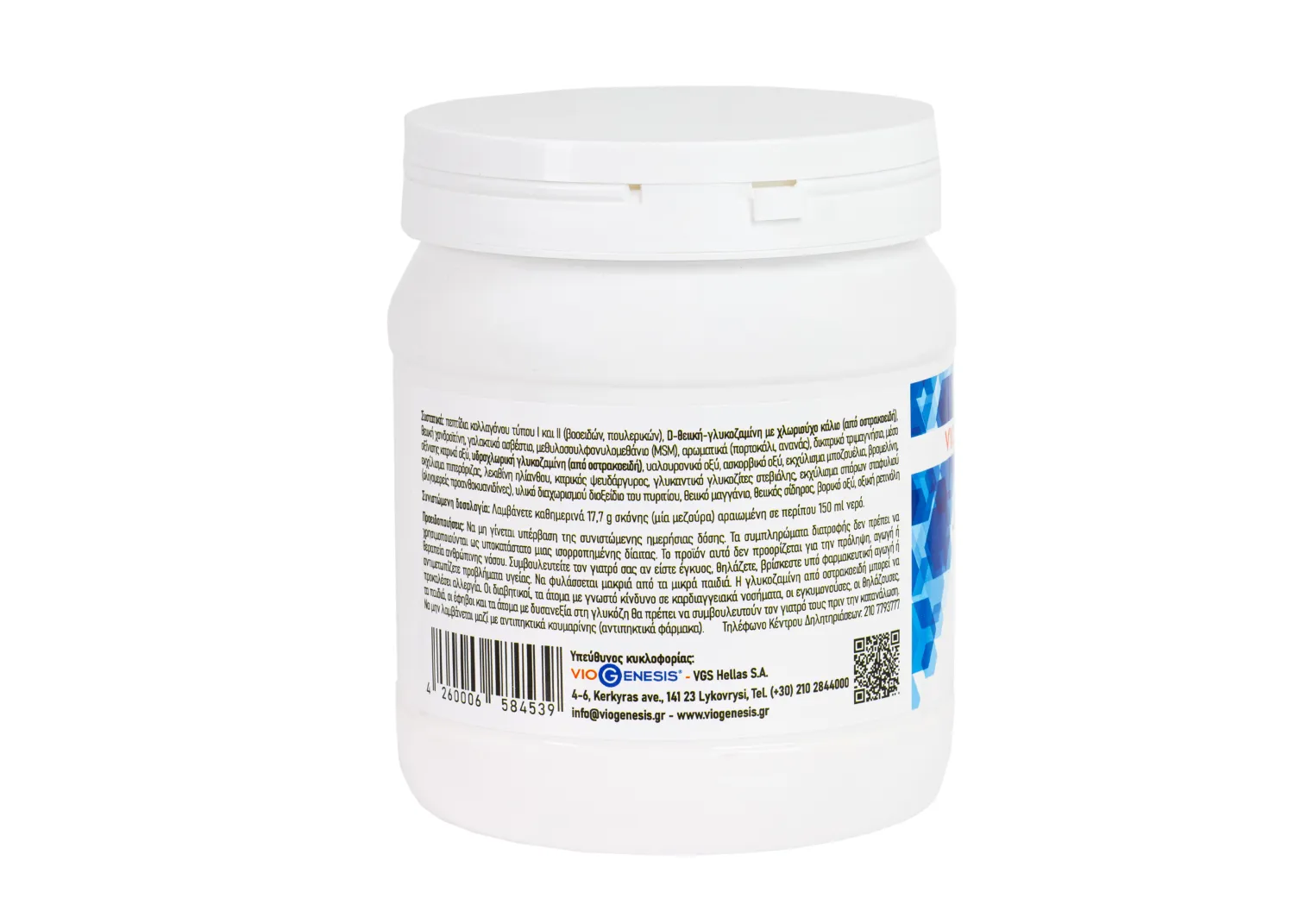 Το VioGenesis Joint Vital Drink Powder αποτελεί µία ολοκληρωµένη φόρµουλα η οποία, χάρη στη σύνθεσή της, συμβάλλει στη φυσιολογική λειτουργία των αρθρώσεων. Με στέβια και γεύση πορτοκάλι. Η φόρµουλα αυτή αποτελείται από πεπτίδια υδρολυμένου κολλαγόνου τύπου Ι & ΙΙ µαζί µε θειική χονδροϊτίνη, θειική γλυκοζαµίνη, υαλουρονικό oξύ, MSM, βρωμελαΐνη, εκχύλισμα τζίντζερ, ρητίνη Boswellia serrata και εκχύλισμα σπόρων σταφυλιού, ανόργανα συστατικά όπως το ασβέστιο, ο ψευδάργυρος, το μαγγάνιο, το βόριο αλλά και βιταμίνες A και C. Πιο συγκεκριμένα:
