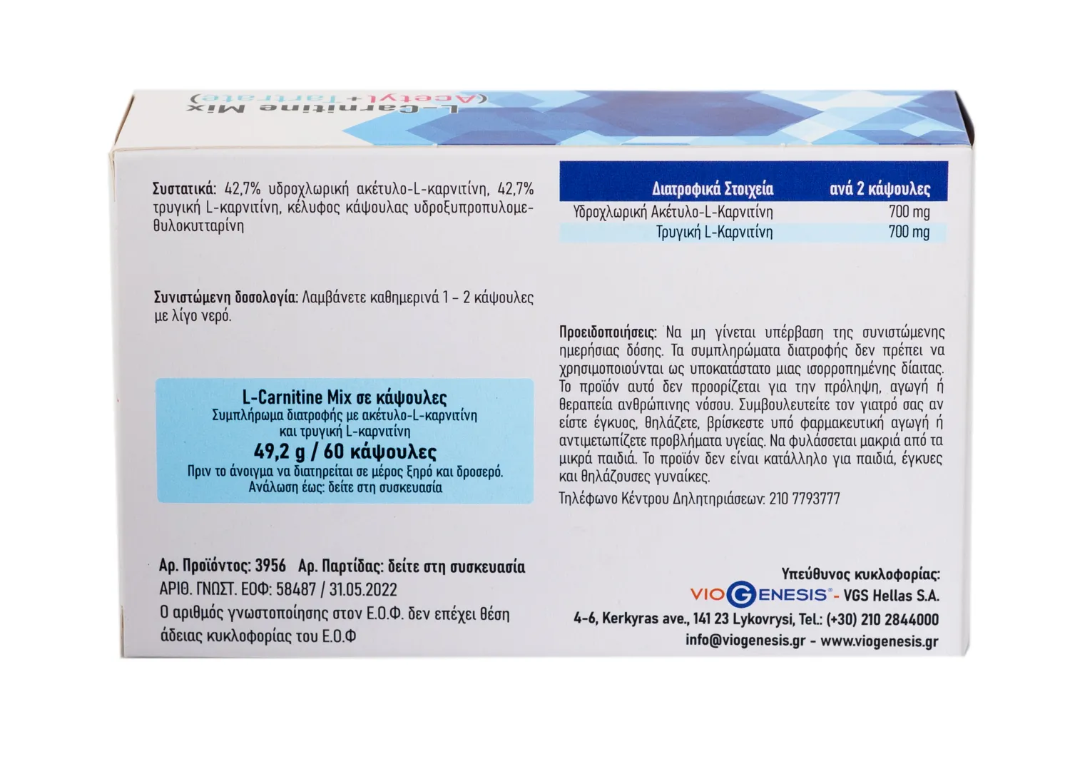 L Carnitine Mix (60 κάψουλες). Υποστηρίζει τον μεταβολισμό του λίπους και την ενέργεια.