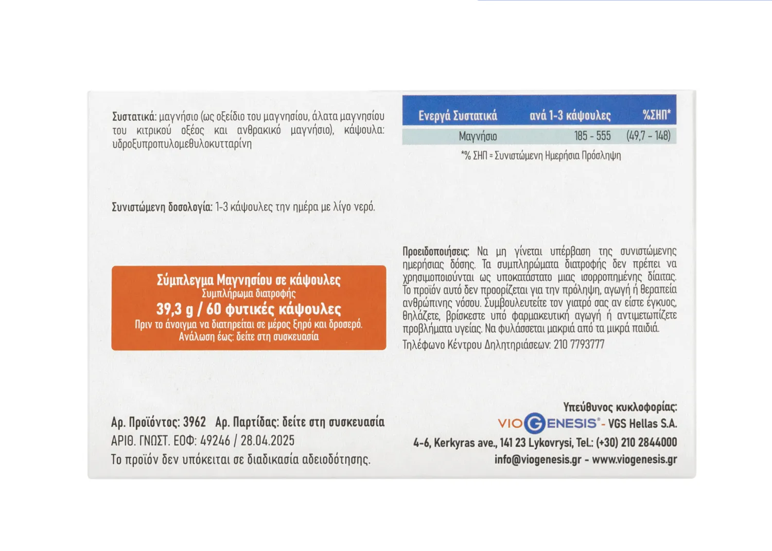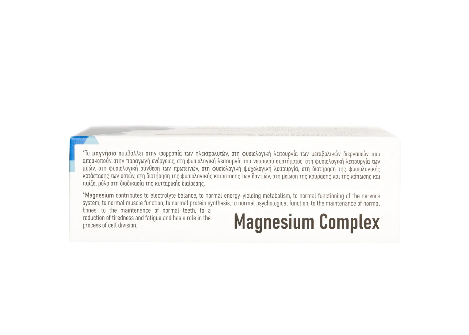 Σύνθεση τριών ειδών μαγνησίου (άλατα μαγνησίου του κιτρικού οξέος, ανθρακικό μαγνήσιο και οξείδιο του μαγνησίου) σε μία κάψουλα. Το σύμπλεγμα μαγνησίου παίζει σημαντικό ρόλο σε πληθώρα φυσιολογικών διεργασιών στον ανθρώπινο οργανισμό.