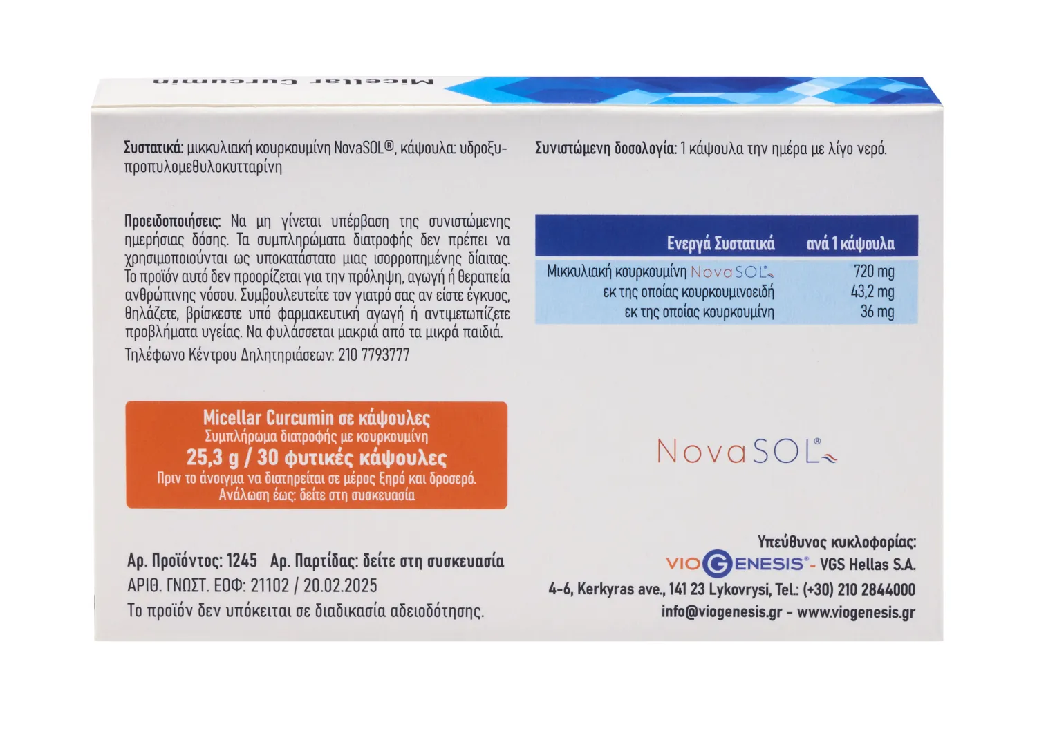 Δραστικά συστατικά: μικκυλιακή κουρκουμίνη NovaSOL®